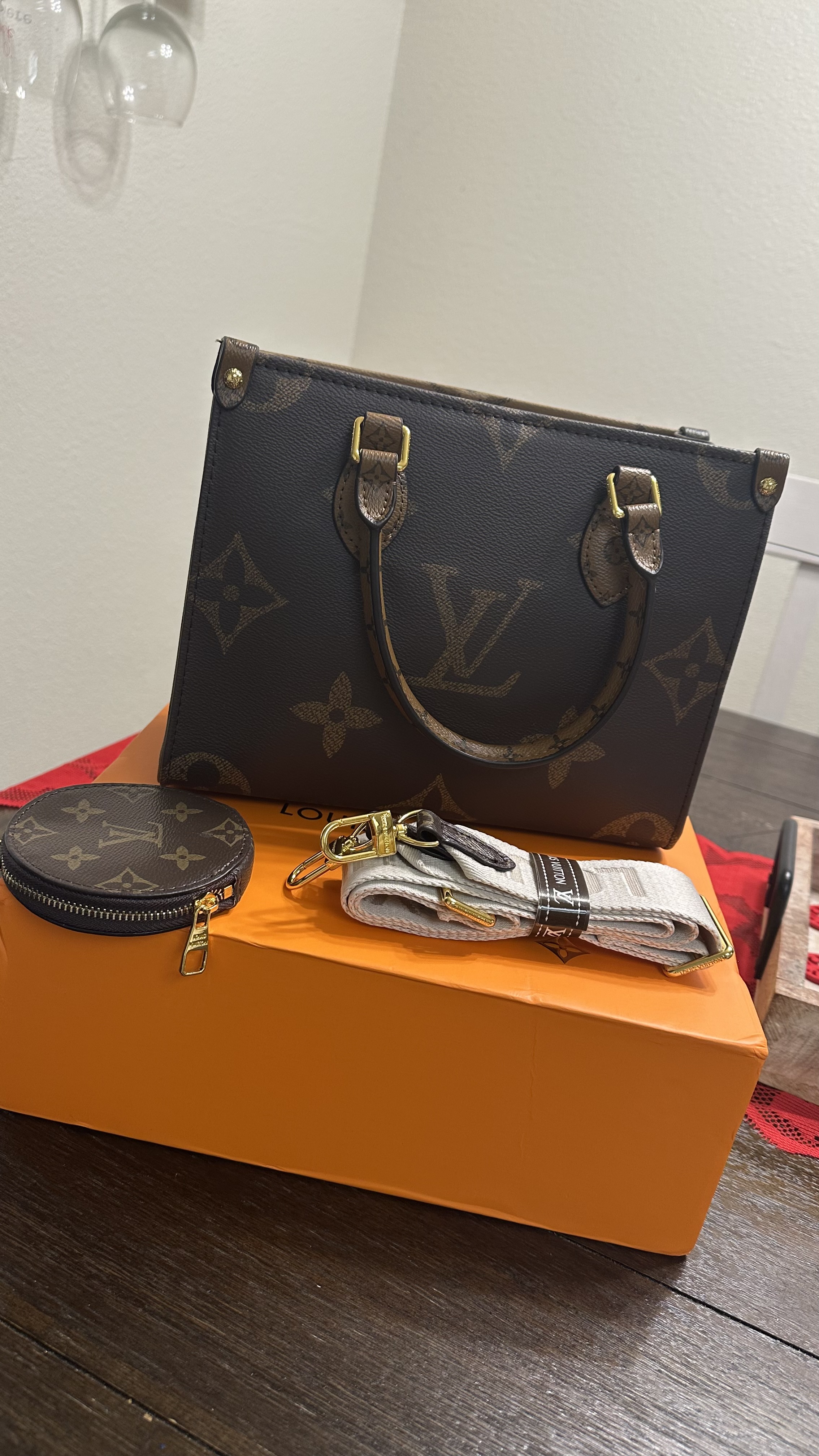 Shocked at the fantastic quality of this bag. Feels like expensive material. Looks beautiful and includes all the engravings and details inside. Came with adust bag, long and short strap. Absolutely obsessed with this bag and will be ordering in more colours. Delivery only took 2 weeks so came surprisingly fast! Definitely recommend!