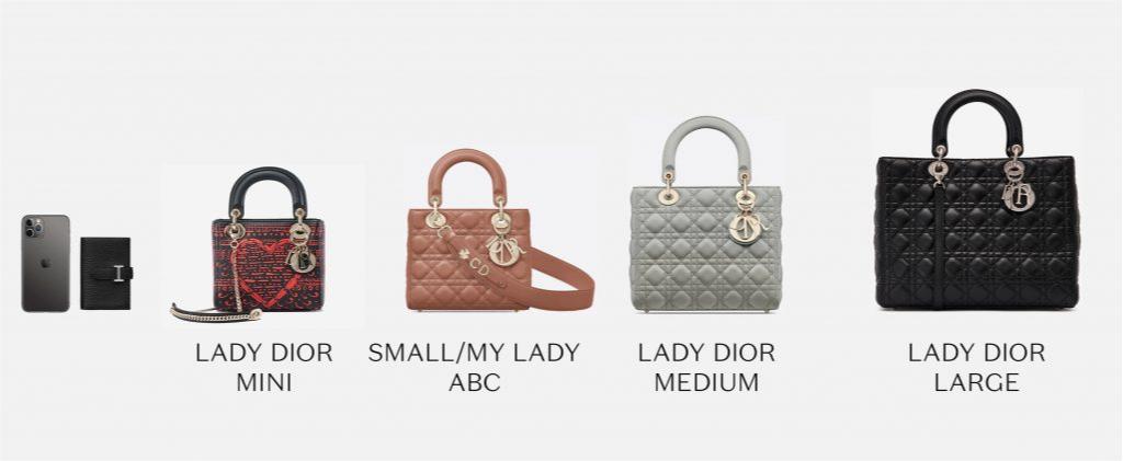 Bag Size Measurement in cm Lady Dior Mini 17 x 15 x 7 cm Lady Dior Small/MyABC 20 x 16.5 x 8 cm Lady Dior Medium 24 × 20 × 11 cm Lady Dior Large 32 × 25 × 11 cm